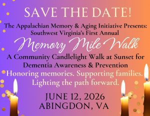 Save the Date for the First Annual Memory Mile Walk, a community event in Abingdon, Virginia, focused on dementia awareness, remembrance, and support for families across Southwest Virginia.