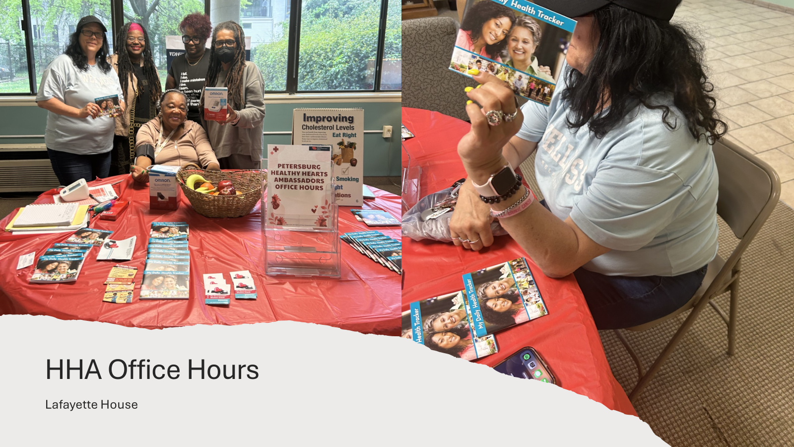 • 건강한 심장 허브(Healthy Hearts Hubs) 5개 고층 아파트 단지: 샤롬 농장(Shalom Farms), 월넛 힐 약국(Walnut Hill Pharmacy), 페터스버그 시(City of Petersburg)와의 협력으로, 신선한 농산물로 가득 찬 냉장고, 예방접종 및 건강 검진, 고층 아파트 단지 간 교통 지원, 그리고 건강한 심장 대사(Healthy Heart Ambassador, HHA) 혈압 자가 모니터링 프로그램 가입 기회를 제공합니다.