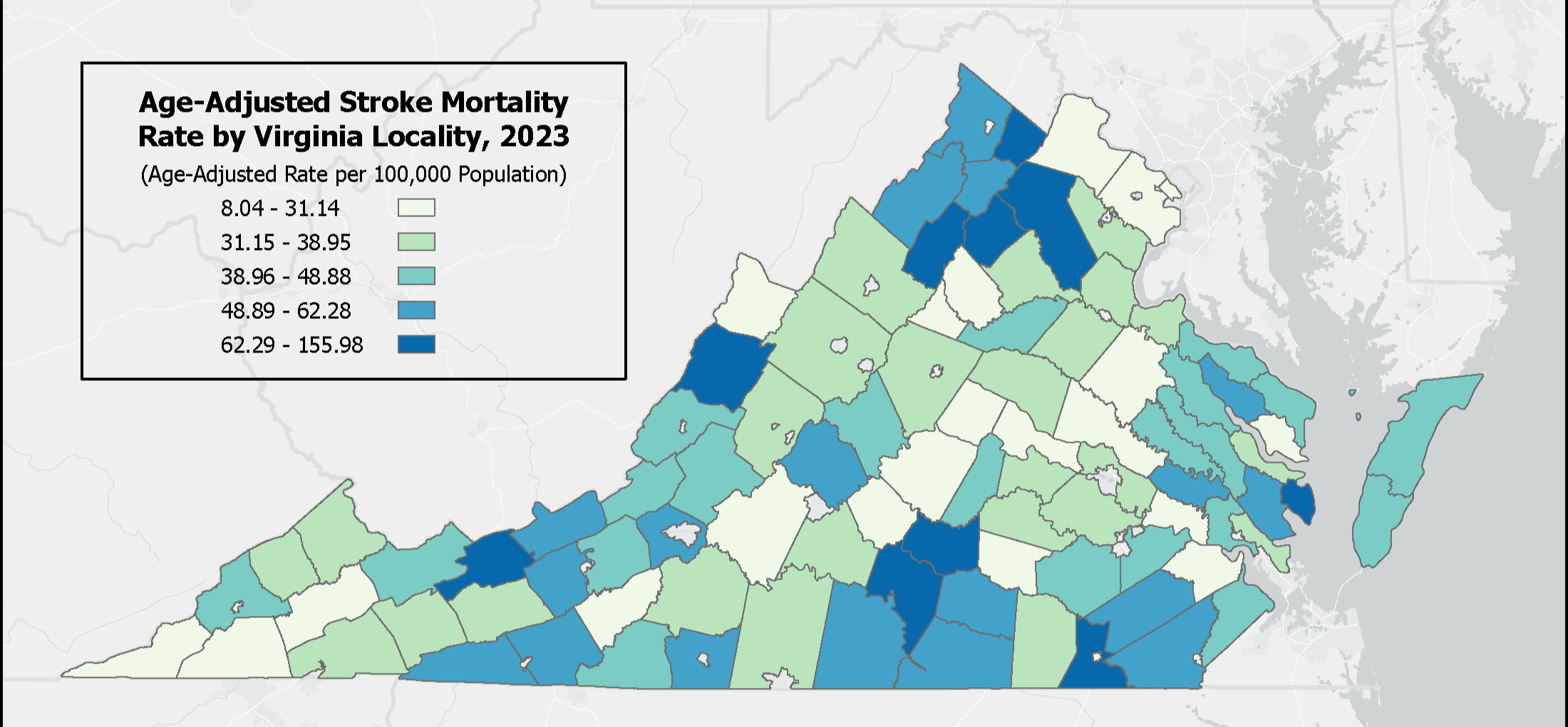 아래 지도는 버지니아의 지역별 연령 조정 뇌졸중 사망률을 표시합니다( 2023). 질병 사양은 다음 ICD-10 퇴원 코드로 정의됩니다: 뇌혈관 - I60-I69, 뇌내출혈(ICH) - I60-I62, 급성 허혈성 뇌졸중(AIS) - I63-I69 입니다.