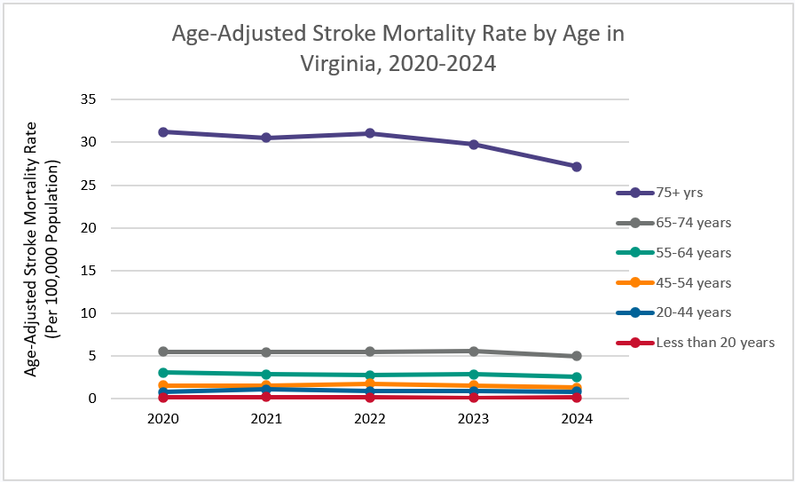 아래 그래프는 버지니아주의 연령별 연령 조정 뇌졸중 사망률 추세를 보여줍니다( 2020-2024). 질병 사양은 다음 ICD-10 퇴원 코드로 정의됩니다: 뇌혈관 - I60-I69, 뇌내출혈(ICH) - I60-I62, 급성 허혈성 뇌졸중(AIS) - I63-I69 입니다.